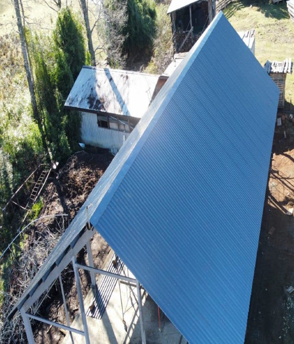 Cubierta industrialEstructura metálica en Iglesia Cudico, Villarrica. Techo de zinc PV8 prepintado gris. Vista aérea.